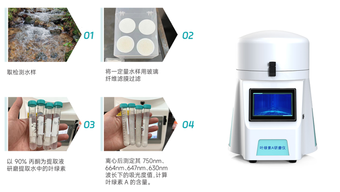 將一定量樣品用濾膜過濾截留藻類,研磨破碎藻類細胞,用丙酮溶液提取葉綠素,離心分離后分別于750nm、664nm、647nm和630nm波長處測定提取液吸光度,根據公式計算水中葉綠素a的濃度。