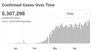 根據世衛(wèi)組織最新實時統(tǒng)計數據,截至北京時間5月26日0時42分,全球累計新冠肺炎確診病例5307298例,死亡病例342070例。