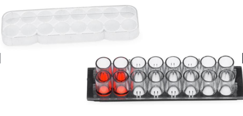 蓋玻片上的腔室共16個,分2排,各8孔(如圖示),每孔的內直徑6mm。設計的每孔體積和孔距與標準96孔板的相同,無細胞毒性的硅膠孔墊片(silicone well gasket)與上層聚苯乙烯材料的腔室(the upper structure,厚0.5mm)和基層的硼硅酸鹽蓋玻片(the substructure,厚0.16-.19mm)形成滴水不漏的密封。有上層腔室時每孔體積250µl,去掉上層腔室后每孔體積9µl。